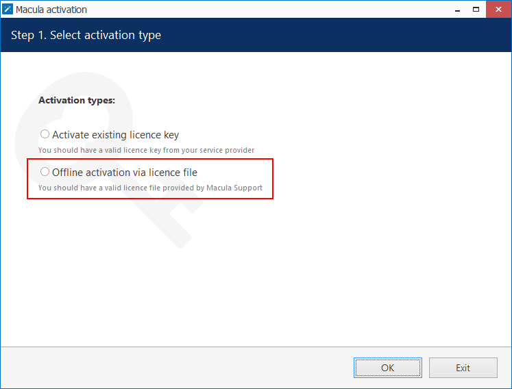 1. If there is no Internet connection for security reasons and/or server disposition particularities, choose the Offline Activation type.