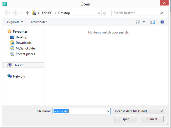 5. Click Browse to locate it and open the license.dat file provided by the activation system.