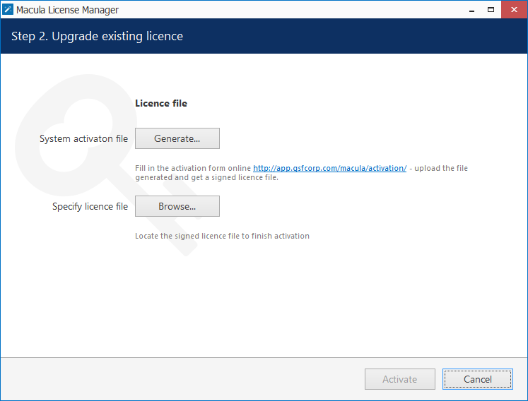 4. Next, copy this binary file to any other computer that has Internet access, then go to the online form available at http://app.gsfcorp.com/macula/activation, fill in the required fields and upload the file. The activation system will process your file and allow you to download a license file. This license file will be unique and will only be valid on the same machine from which the original system.bin file comes.