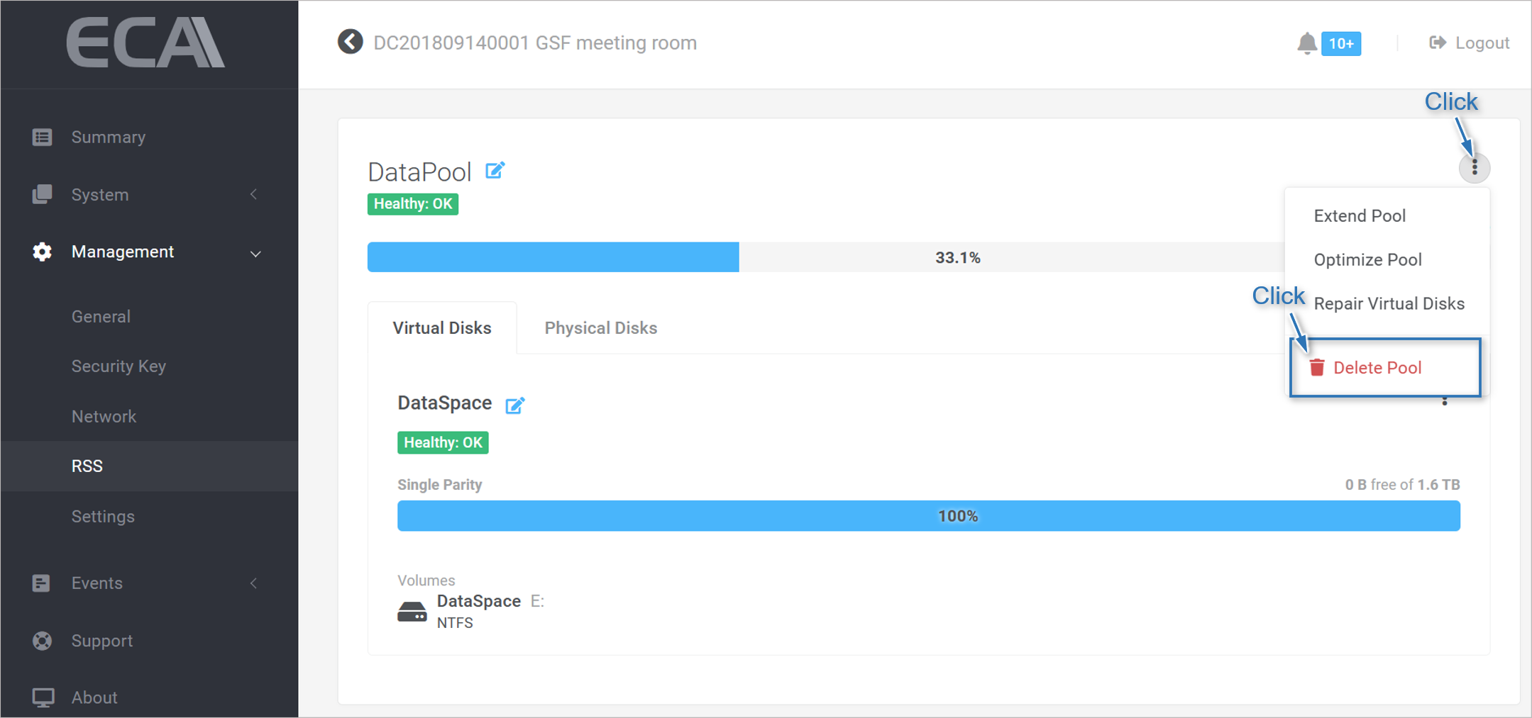 Step 3: To determine which member disk(s) is the cause of the warning, go to Management ▶ RSS. Click on 'Physical Disks' tab in the DataPool. In most cases, the faulty disk will show 'Warning: Lost Communication" in its RSS Status.