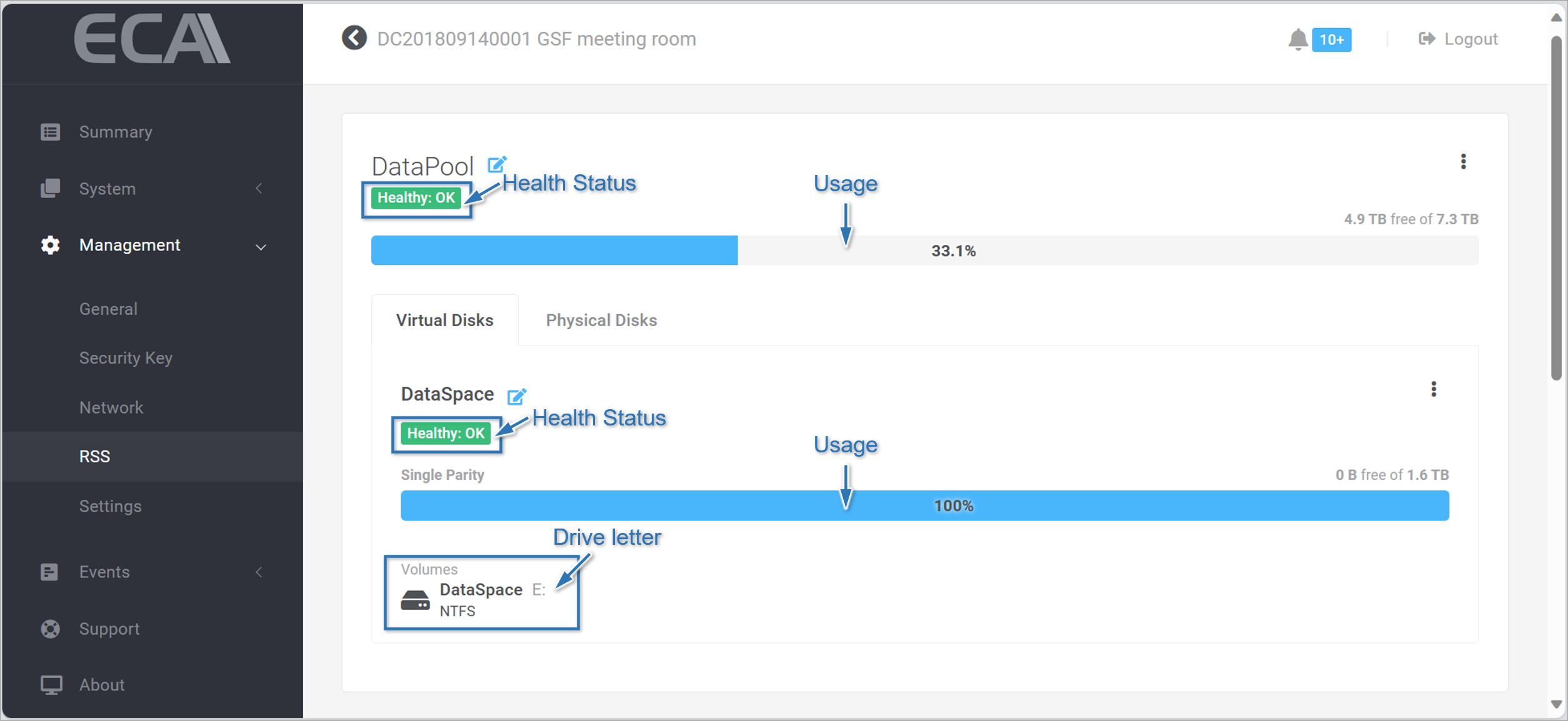 Step 8: The creation of Datapool and DataSpace shall complete instantaneously. Their status are displayed in the RSS, showing the Health status and percentagle of usage. The Drive letter for the DataSpace is auto-assigned, default start with letter 'E'.