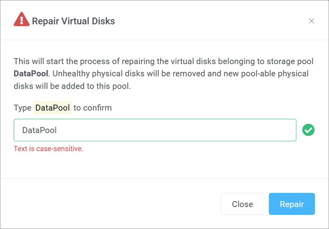 Step 8: Enter the storage pool's name as shown to confirm. Then, click Repair.