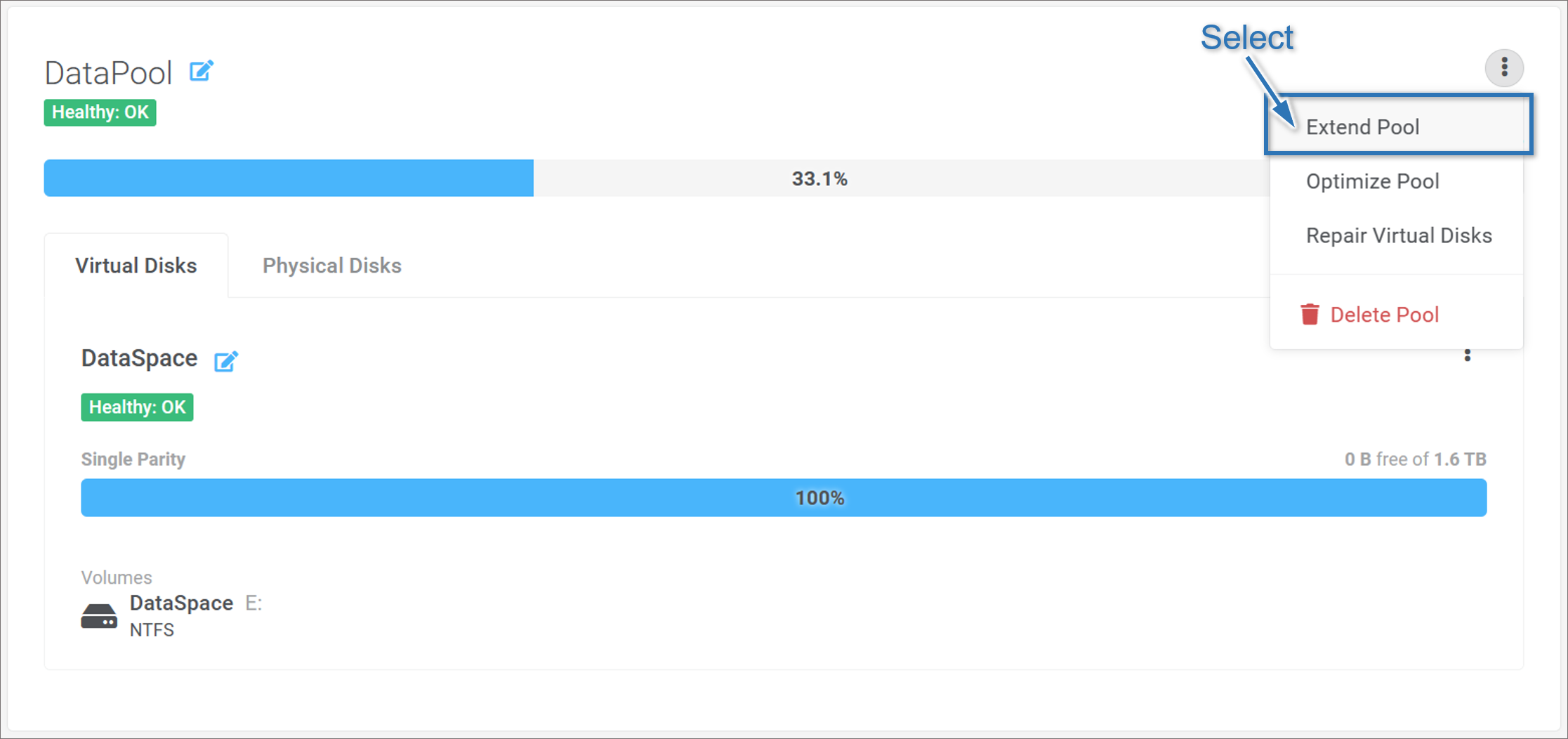 Step 5: Select Optimize storage pool. Then, press Extend
