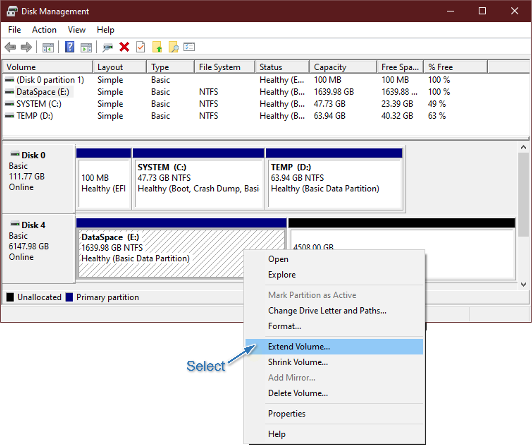 Step 7: After optimization is completed, go to Windows Disk Managament to extend volume. Select Extend Volume...