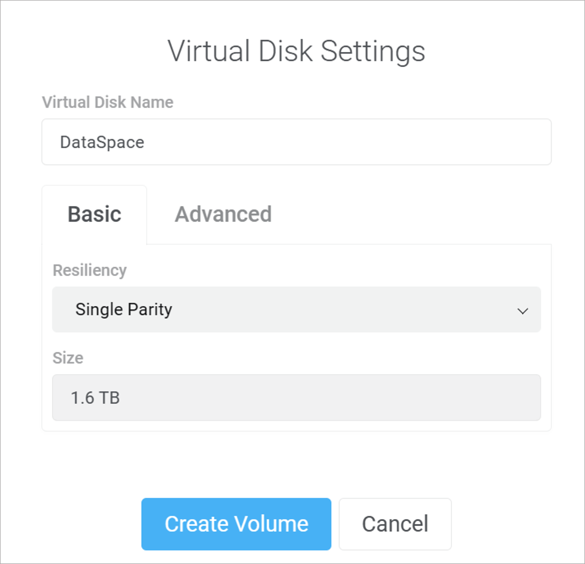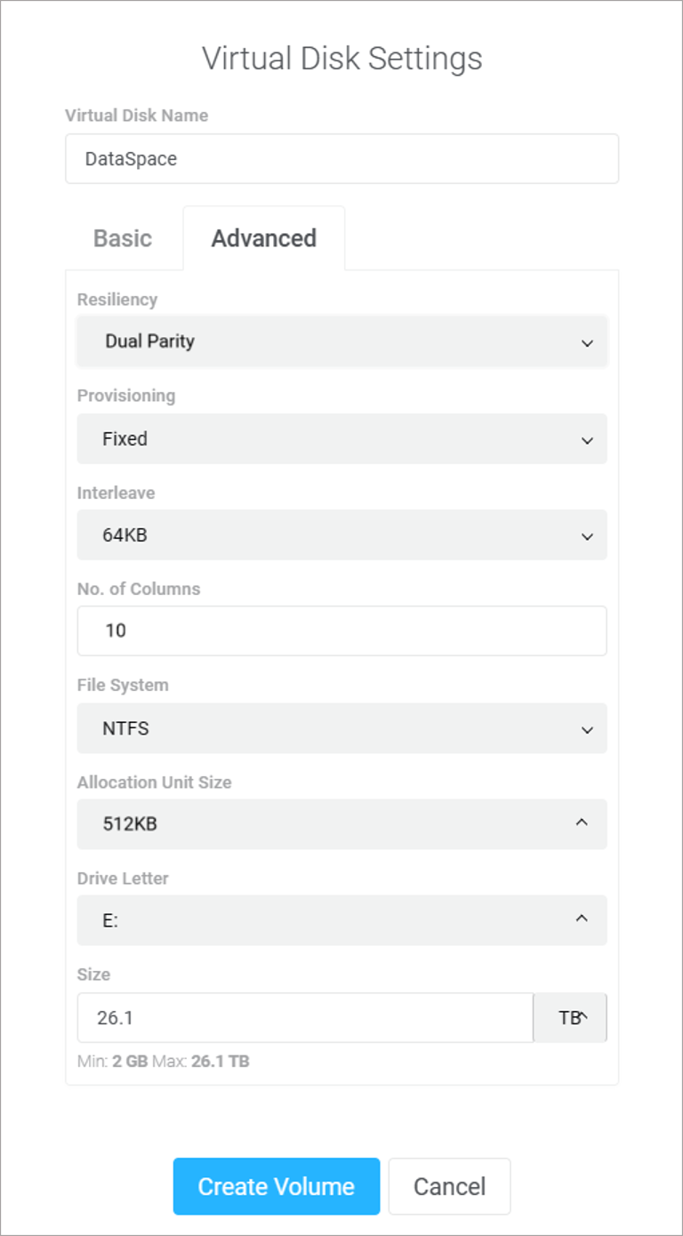 Step 7: Provide a name for the Virtual Disk (default: DataSpace), then click Advanced tab.