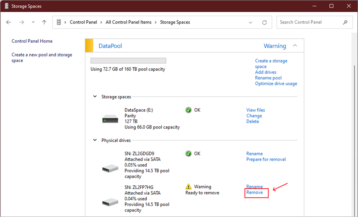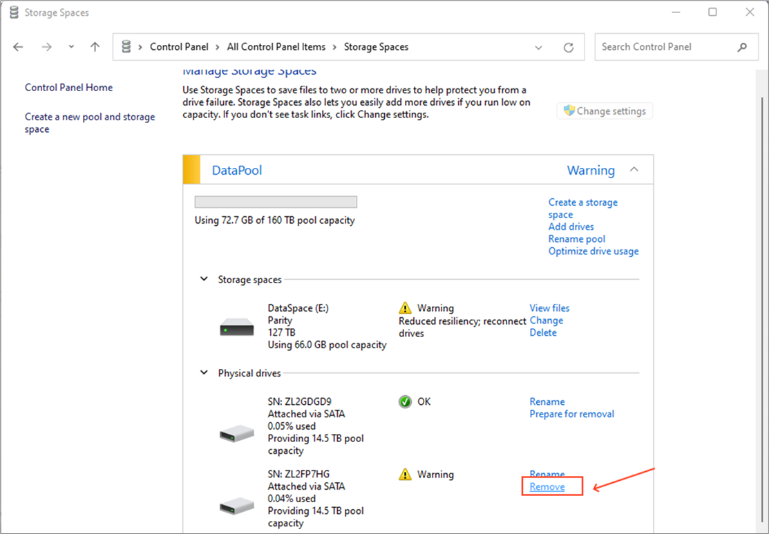 Step 11: From the list of Physical drives, identify from the HDD serial number and the ‘Warning’ status. Click on the ‘Remove’ option that corresponds to the HDD with ‘Warning’ status.
