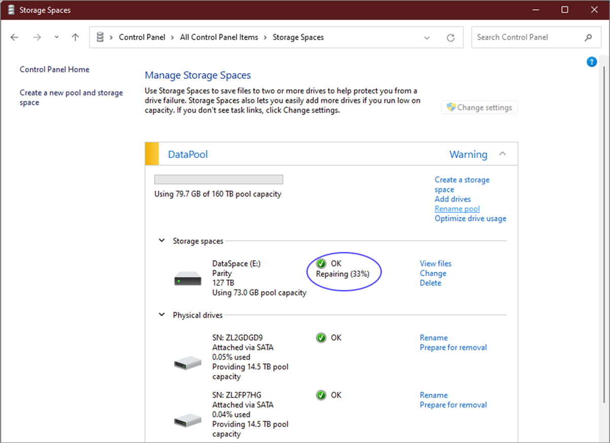 Note: The rate of repair is approximately 1TB per day. So, for example, if a 10TB HDD is being replaced, it would take approximately 10 days to complete the repair process.