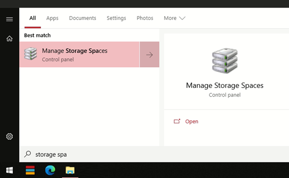 Step 5: On Windows Start, search for ‘Storage Space’. Then, click on ‘Manage Storage Spaces’ to launch.