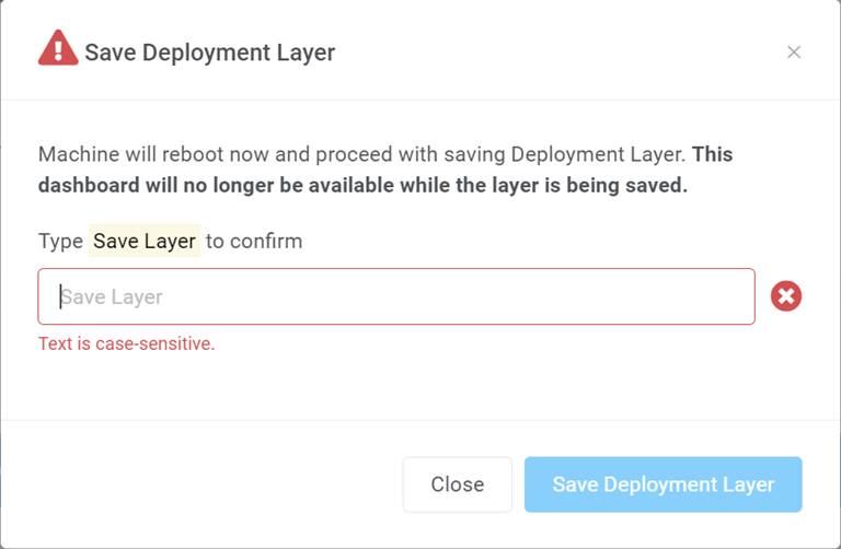 Step 5: Type 'Save Layer ' to confirm proceed. Then, press the 'Save Deployment Layer' button. If you are using the USB Security Key to access the Dashboard, please unplug it now.